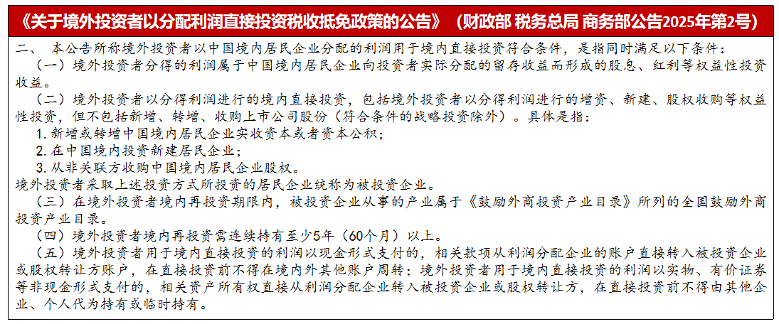 According to the provisions of Announcement No. 2 of 2025, the relevant conditions include that the industry engaged in by the investee enterprise is listed in the *Catalogue of Industries for Encouraging Foreign Investment*, and that the overseas investor shall hold the equity from the domestic reinvestment for at least 5 consecutive years (60 months), with the specific provisions as follows: