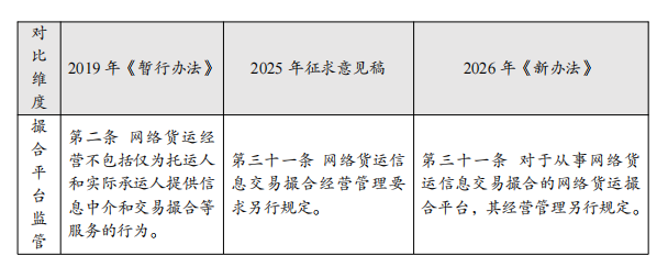 此项修订标志着监管思路的细化。其变化在于,将“信息撮合服务”从2019 年《暂行办法》中简单排除在条款约束之外,转变为在新办法中确认其作为一种需要被另行专门规范的经营模式。这一调整的本质在于,“承运平台”与“撮合平台”在商业模式、法律责任与核心风险上存在差异: