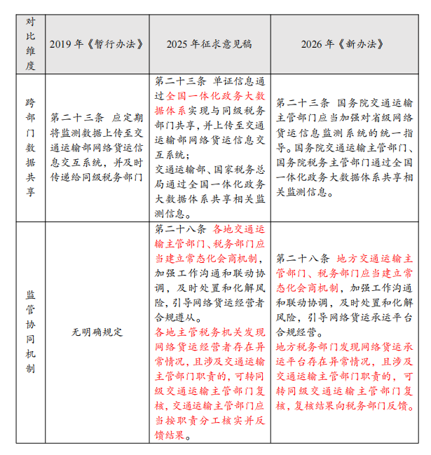 编者按:2026年1月23日,《网络货运承运平台经营管理办法》(交运规〔2026〕1号,以下简称“《新办法》”)正式施行。相较于2019年发布的《网络平台道路货物运输经营管理暂行办法》(以下简称 “《暂行办法》”),《新办法》顺应了税务监管数字化与全国统一大市场建设的趋势,并与2025年已实施的《互联网平台企业涉税信息报送规定》(以下简称 “涉税信息报送规定”)等规定相衔接,共同构建起更为严格的监管体系。《新办法》着重通过明确平台责任、强化数据共享与业务全流程追溯破解行业长期存在的虚开发票、业务不实等痛点问题。本文将通过对比新旧条款,分析具体变化与影响,并为平台提供合规操作建议。