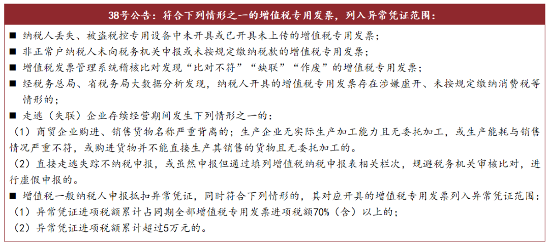 编者按:增值税以商品生产流通中各个环节的新增价值为征税基础,购买方基于含税购入价取得抵扣权益并依法抵扣发票上注明的税额,该征税机制在实现各环节税款征收的同时也避免了重复征税。在目前的征管实践中,“凭票抵扣”是实现增值税征纳的核心,为打击“假企业”骗领增值税专用发票、实施违法虚开行为后快速走逃等扰乱税收征管秩序的行为,《关于异常增值税扣税凭证管理等有关事项的公告》(国家税务总局公告2019年第38号)等政策规定了多种异常增值税扣税凭证(以下简称异常扣税凭证)情形,明确受票方取得的发票被认定异常的,需先作增值税进项转出,并规定了核实的程序。异常扣税凭证制度通过对受票企业发票抵扣的监管,避免了因上游企业异常导致国家税款损失进一步扩大的风险。在异常扣税凭证制度实施的过程中,关于认定情形、认定后果等在实践中存在诸多争议,本文就常见问题予以解析,供读者参考。