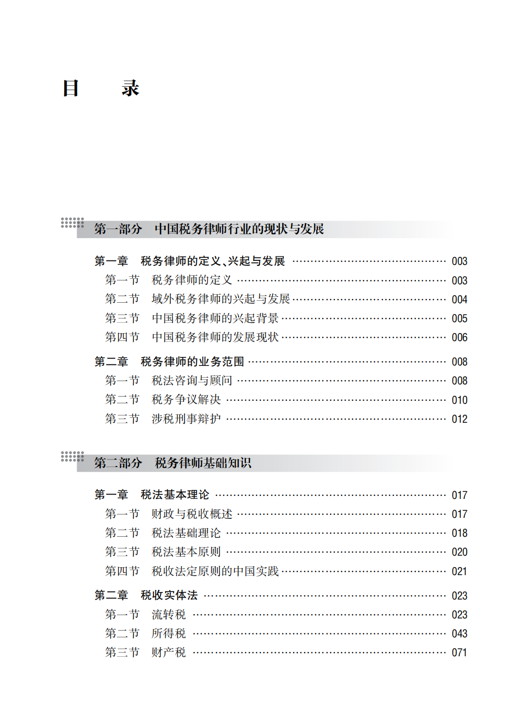 本书对于立志进入税法服务领域发展的执业律师具有重要的指引和借鉴意义,是税务律师执业必备的工具书,也是广大法学院在校生进入财税法律实务领域的启蒙书籍。希望本书能够激励和鼓舞更多有志之士投身税务律师的行业中来,为国家的财税法治建设和纳税人合法权益保护工作贡献力量。