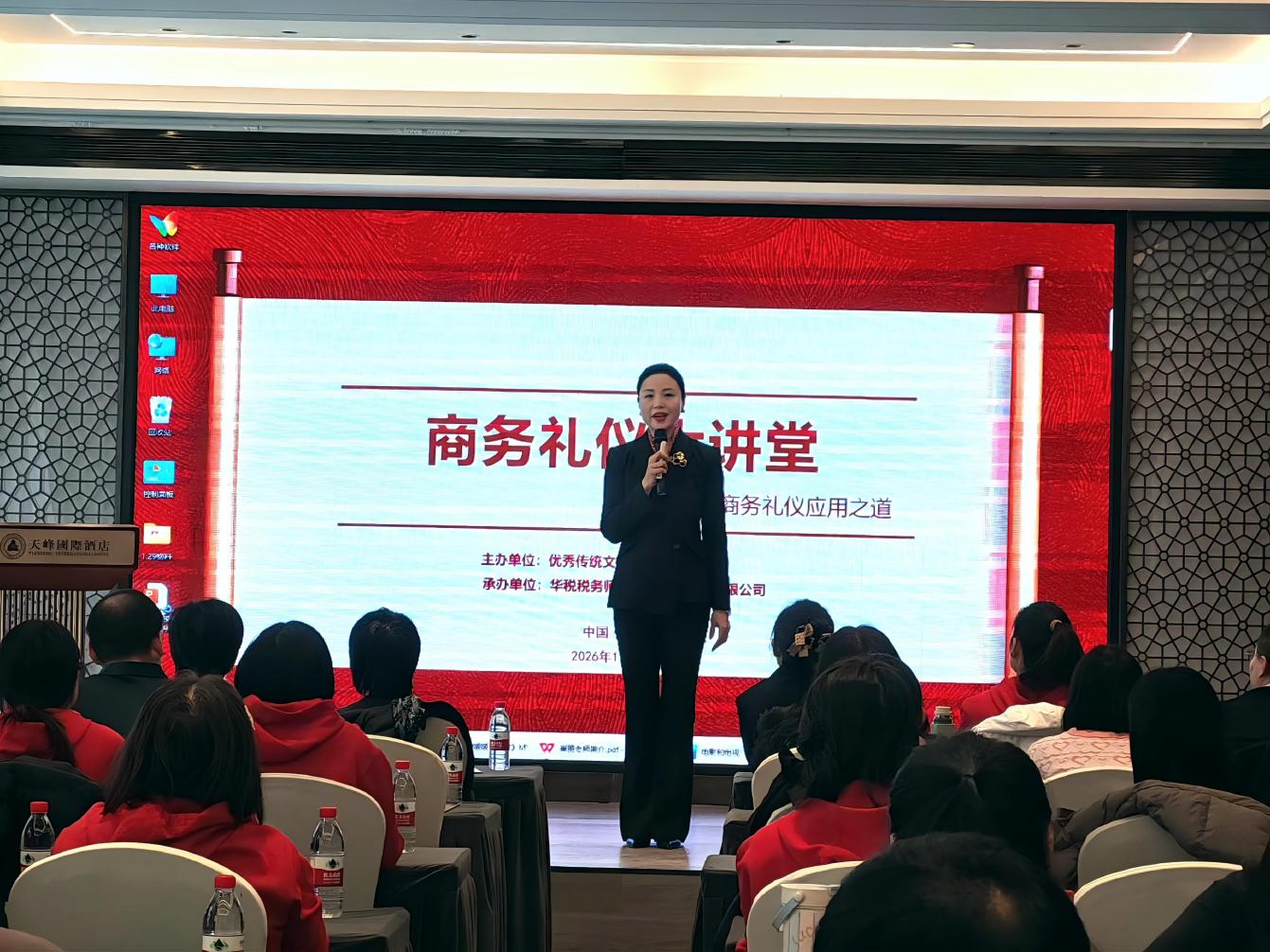 为践行公司文化理念,让中华礼仪之光照亮商务之路,1月29日下午3点,由优秀传统文化榆林理事会主办、华税(陕西)承办的《商务礼仪大讲堂》在榆林市天峰酒店会议厅精彩开讲。活动特邀国内知名的礼仪专家崔丽老师主讲。崔老师拥有丰富的商务礼仪教学经验和深厚的文化底蕴,她以生动有趣的方式,从商务场合的着装规范、言谈举止到沟通技巧等方面,为现场的嘉宾带来了一场别开生面的知识盛宴。这一活动彰显华税(陕西)对员工综合素质培养的重视,以及对传承和弘扬中华优秀传统文化的积极担当。