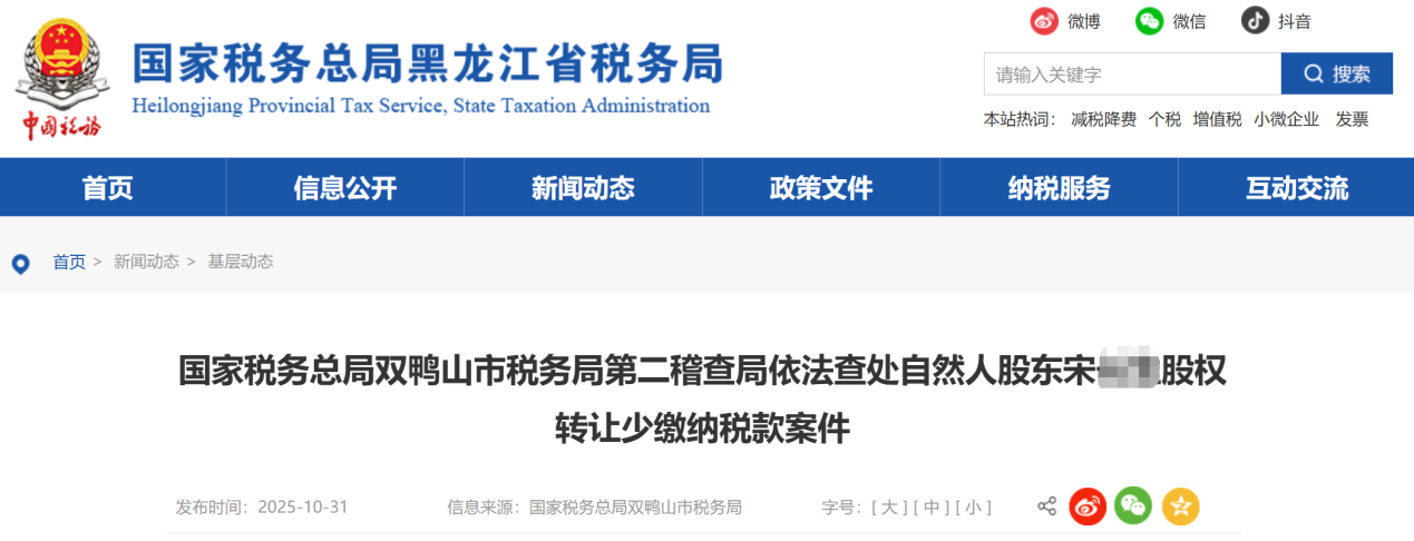 近期,国家税务总局双鸭山市税务局第二稽查局根据举报线索和税收大数据,查处了一起自然人股东进行股权转让少缴纳税款案件。经查,自然人股东宋某某将其持有的某煤业公司股权进行转让,取得收入未进行纳税申报,少缴个人所得税、印花税等税款148.66万元。国家税务总局双鸭山市税务局第二稽查局依据《个人所得税法》《税收征收管理法》等法律法规相关规定,依法对宋某某追缴税款、加收滞纳金并处罚款共计182.02万元。目前,涉案税款、滞纳金、罚款均已追缴入库。