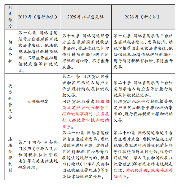 编者按:2026年1月23日,《网络货运承运平台经营管理办法》(交运规〔2026〕1号,以下简称“《新办法》”)正式施行。相较于2019年发布的《网络平台道路货物运输经营管理暂行办法》(以下简称 “《暂行办法》”),《新办法》顺应了税务监管数字化与全国统一大市场建设的趋势,并与2025年已实施的《互联网平台企业涉税信息报送规定》(以下简称 “涉税信息报送规定”)等规定相衔接,共同构建起更为严格的监管体系。《新办法》着重通过明确平台责任、强化数据共享与业务全流程追溯破解行业长期存在的虚开发票、业务不实等痛点问题。本文将通过对比新旧条款,分析具体变化与影响,并为平台提供合规操作建议。