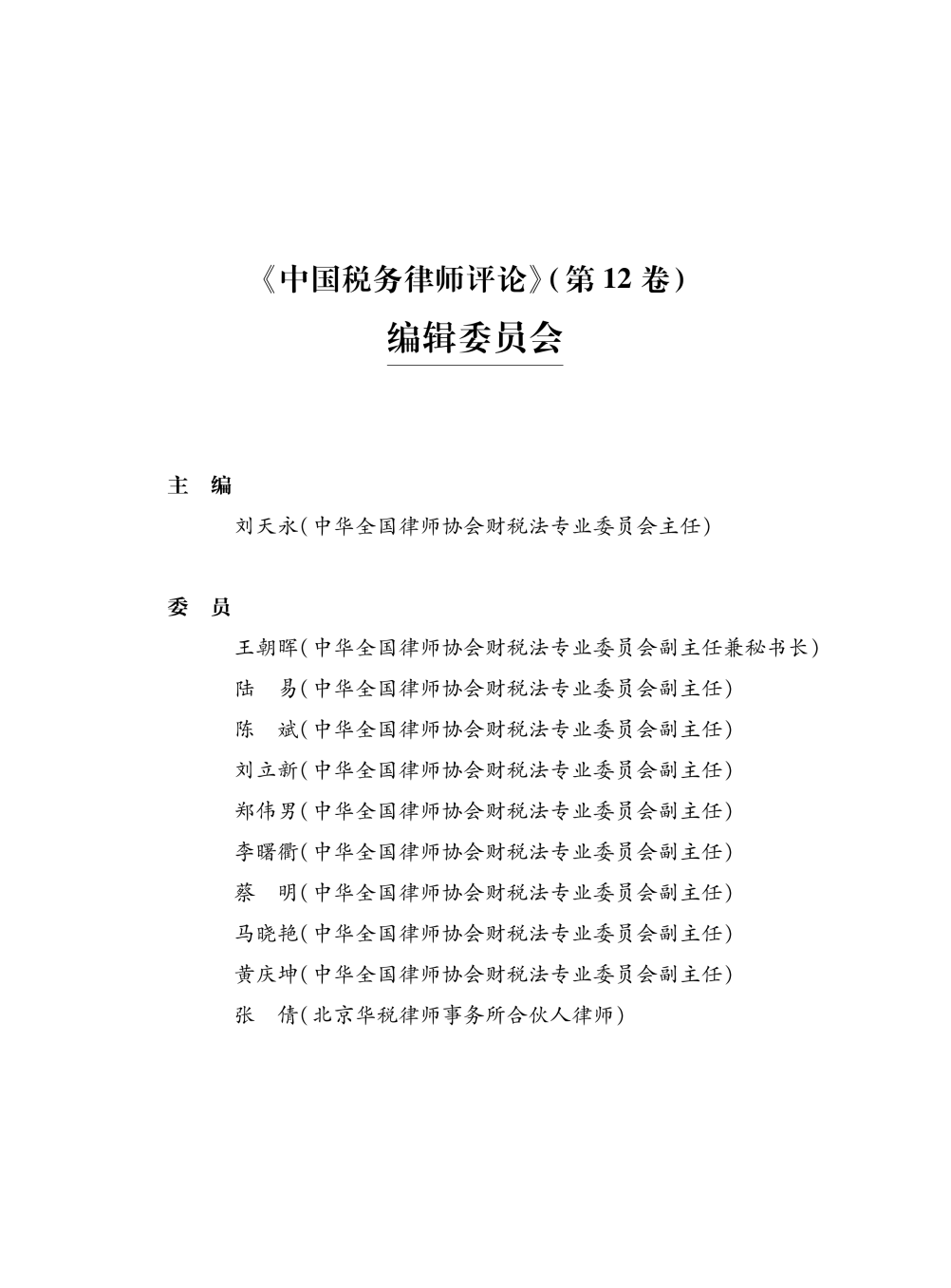 《中国税务律师评论》是由中华全国律师协会财税法专业委员会编、华税刘天永律师主编的税务行业专业性连续出版物,至今已连续出版12卷,前11卷在法律界和财税界受到了广泛的关注与好评。